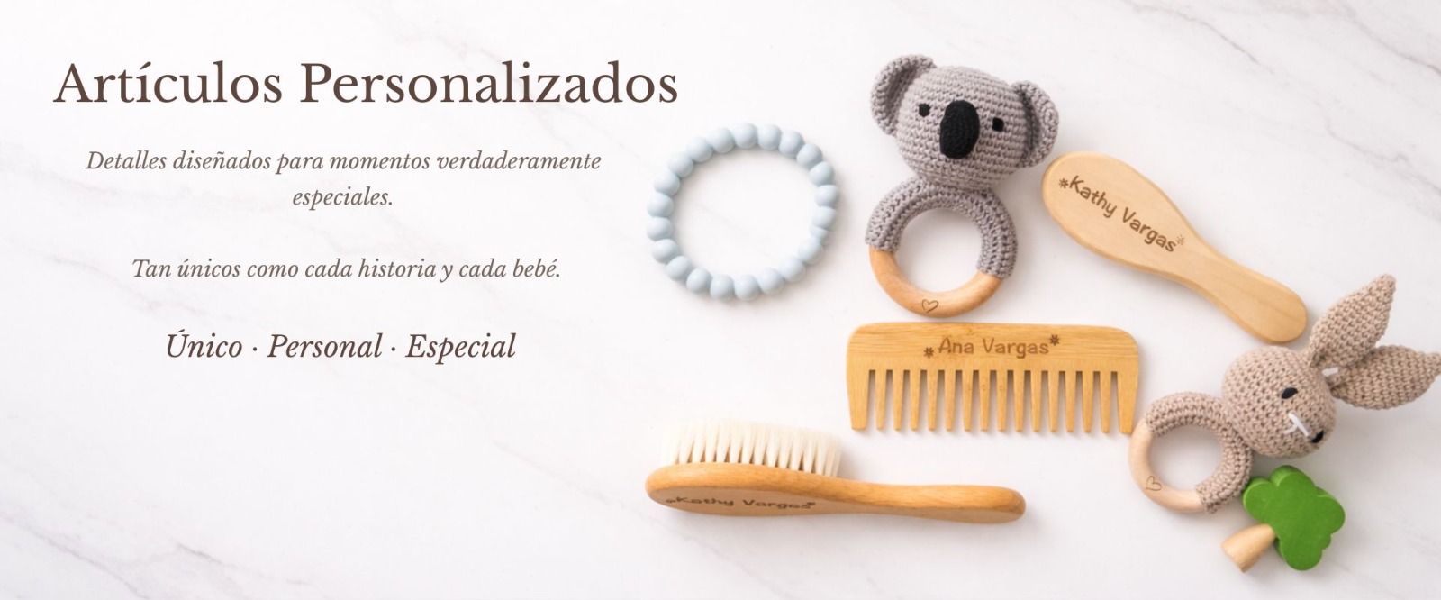 Desde suaves cepillos de cerdas naturales, hasta sonajeros y portachupones, nuestros productos combinan funcionalidad, ternura y un toque único que los hace irrepetibles.